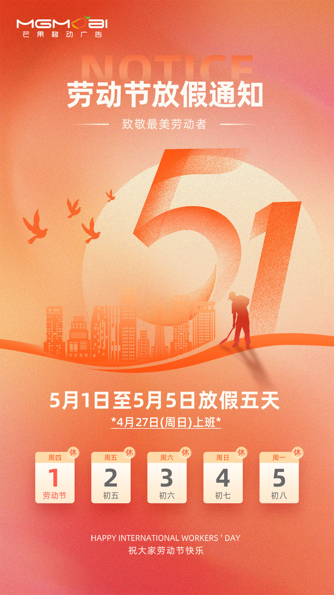 调休安排:4月27日(星期日)正常上班。